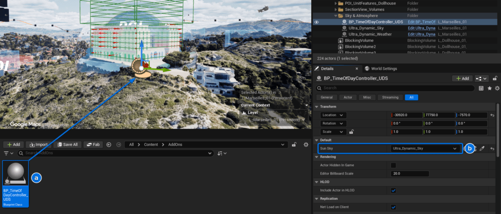 6. Place and Link the UDS Controller Drag your newly imported BP_TimeOfDayController_UDS into the level. With the controller selected, go to the Details panel and assign your Ultra_Dynamic_Sky actor to the Sun Sky property.
