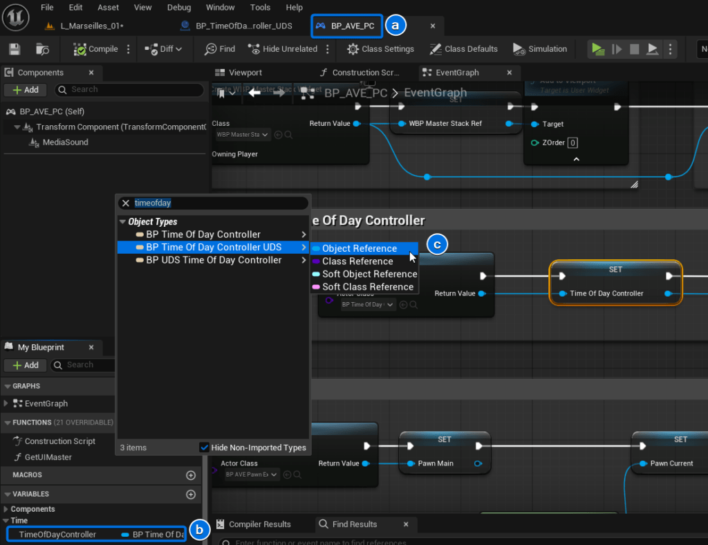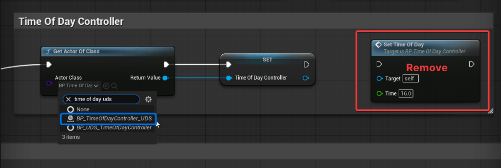 7. Update the Player Controller Open the BP_AVE_PC Player Controller blueprint. Locate the existing TimeOfDayController variable and change its Variable Type to reference BP_TimeOfDayController_UDS. Compile and save the blueprint.