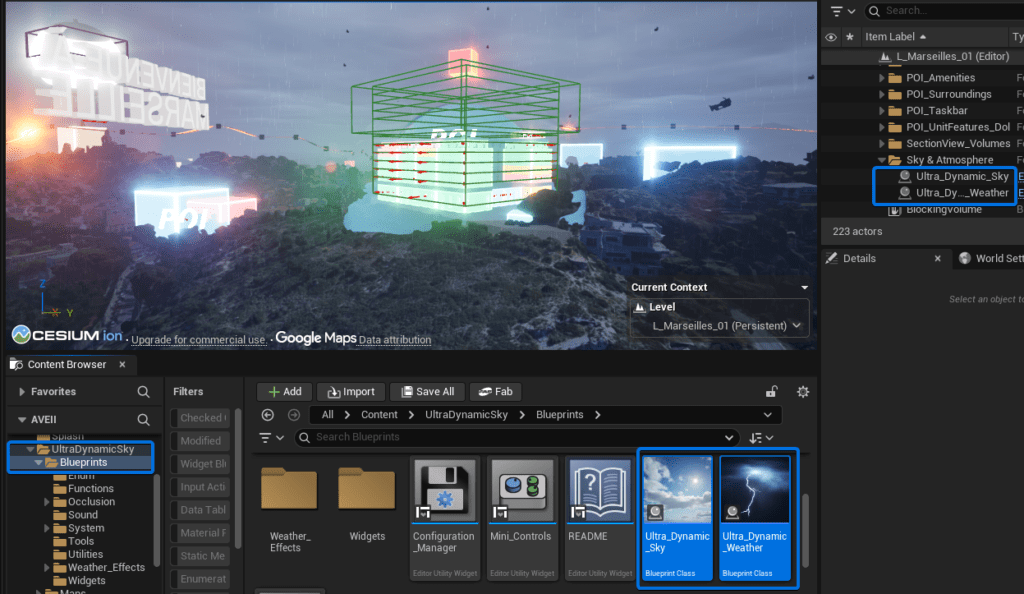 Open the Content Browser and navigate to UltraDynamicSky > Blueprints. Drag and drop both the Ultra_Dynamic_Sky and Ultra_Dynamic_Weather Blueprints directly into your level.