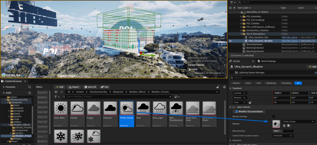 After adding UDS, Points of Interest (POIs) may glow excessively due to lower default lighting. Select Ultra_Dynamic_Sky in the Outliner. In the Details panel, navigate to E1 Sun > Sun Light Intensity and set the value to 7500 lux.